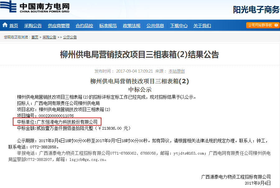 柳州供電局營銷技改項目三相表箱(2)中標結果公告