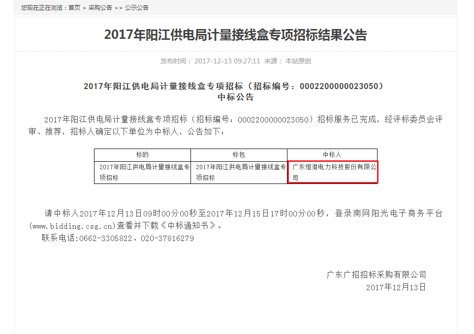 2017年陽江供電局計量接線盒專項招標結果公示