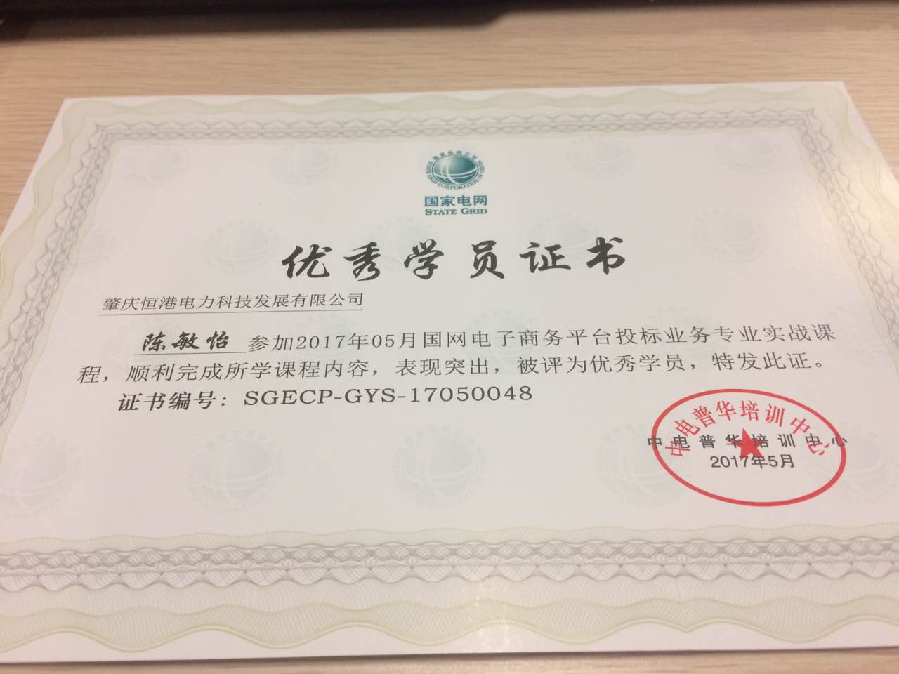 恭喜我司在參加2017年5月國網電子商務平臺投標業務專業實戰課程獲得優秀學員獎,這一期共有52位學員參與,只有三個優秀學員名額,我司員工是其中一位