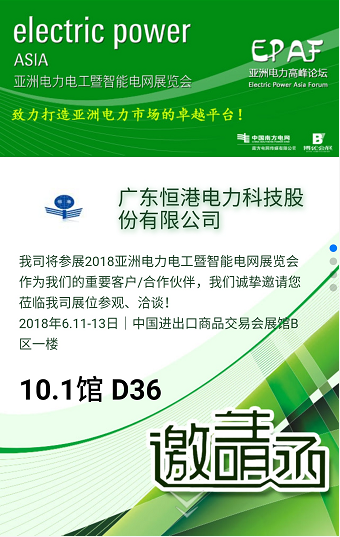 6月11-13日,我司將參展2018亞洲電力電工暨智能電網展覽會,我們誠摯邀請您蒞臨我司展位參觀、洽談!