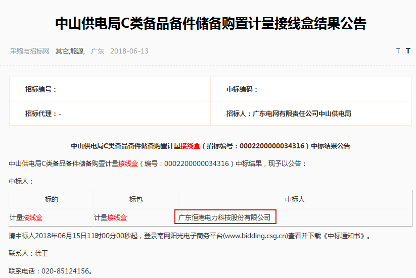 中山供電局C類備品備件儲備購置計量接線盒中標結果公告