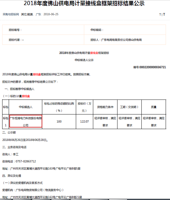 2018年度佛山供電局計量接線盒框架招標(biāo)結(jié)果公示