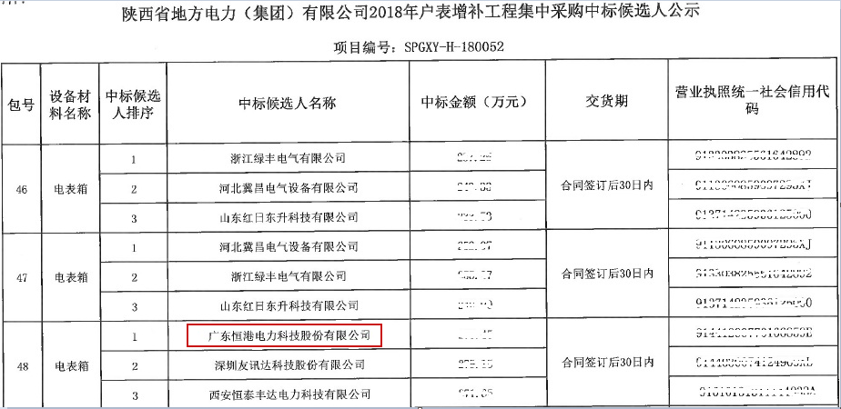 熱烈祝賀我司在陜西省地方電力(集團)有限公司2018年戶表增補工程集中采購項目招標(SPGYX-H-180052)中標