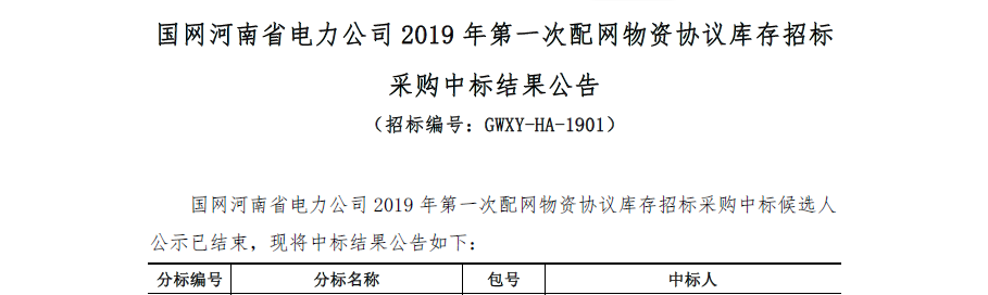 熱烈祝賀我司在國網河南省電力公司2019年第一次配網物資協議庫存招標采購中標