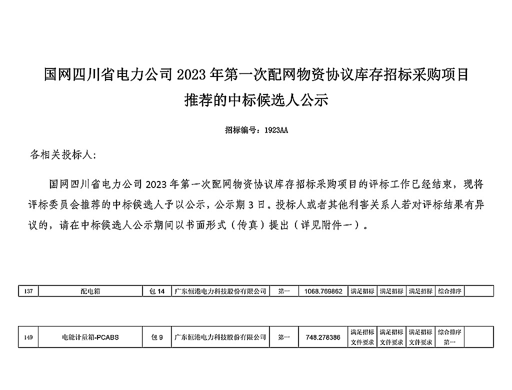 春風人間四月天,中標喜訊接踵至。4月28日 國網(wǎng)四川省電力公司傳來捷報,廣東恒港電力科技股份有限公司中標國網(wǎng)四川省電力公司2023年第一次配網(wǎng)物資協(xié)議庫存招標采購項目電能計量箱PC+ABS 分標和配電箱分標。成績的取得凝聚著恒港人的辛勤付出,得益業(yè)內(nèi)外合作者的信任和支持。恒港公司將不負眾望,上下一心全力以赴,奮勇向前,再奪佳績!!!