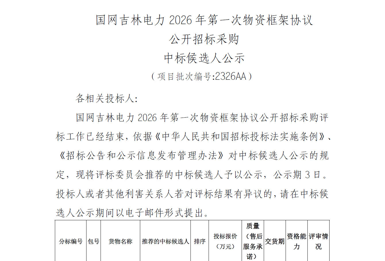 【中標喜訊】熱烈祝賀我司中標國網(wǎng)吉林電力2026年第一次物資框架協(xié)議公開招標采購項目